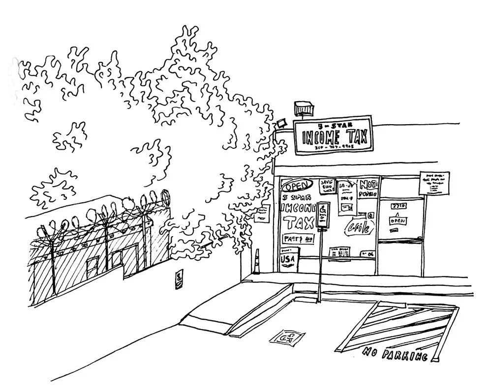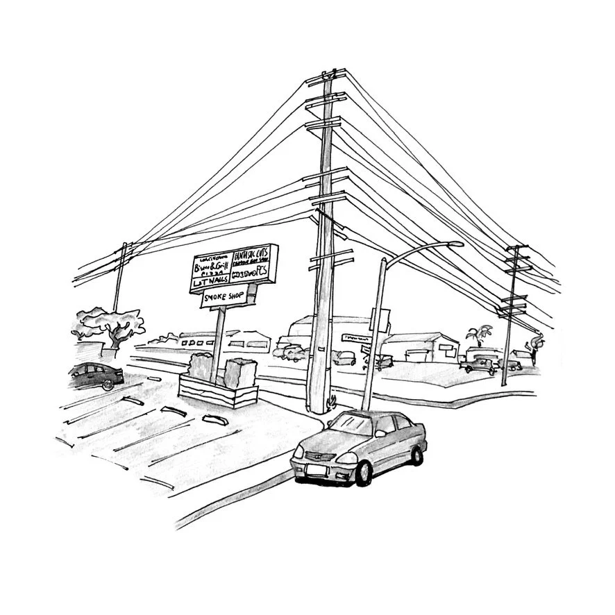 Drawings were created in pen with no prior drafting or sketching in an attempt to capture the unfiltered energy of the urban United States.